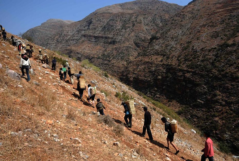 村民背著水走在陡峭的山崖上(3月7日攝)。村民需要背著幾十公斤重的水桶,從海拔1000多米的江邊,小心翼翼地往海拔1800多米的村中跋涉。圖片來(lái)源:新華網(wǎng) 秦晴 攝