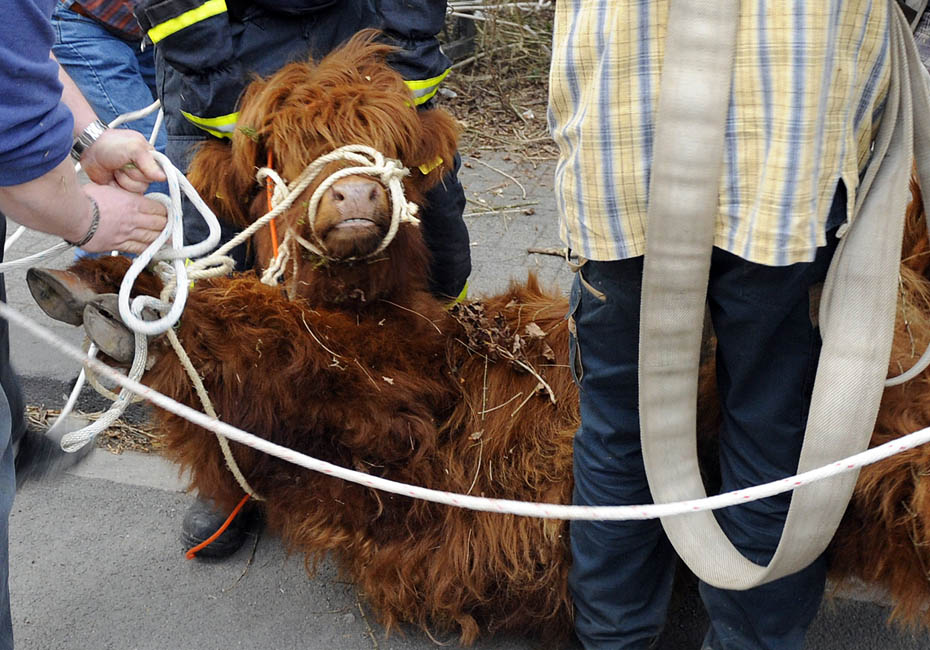 3月18日,德國(guó)一頭蘇格蘭高地牛來(lái)到一居民院內(nèi)懶洋洋的曬太陽(yáng),最后經(jīng)過(guò)獸醫(yī)的麻醉和消防員協(xié)力才將這頭蠻力十足的家伙“制服”。圖片來(lái)源:中國(guó)新聞網(wǎng)