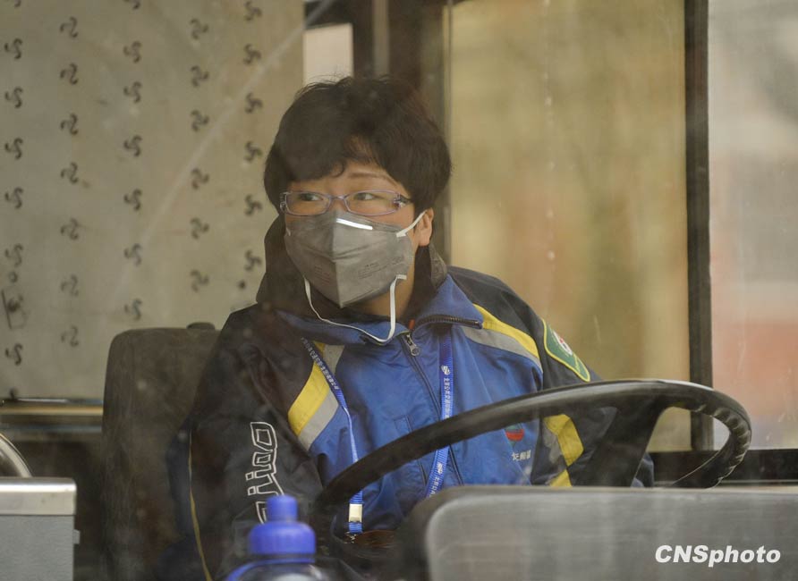 3月20日,春季首場(chǎng)重度浮塵天遮蓋了整個(gè)北京城。圖為一位公交車(chē)司機(jī)戴上防塵口罩。中新社發(fā) 廖攀 攝