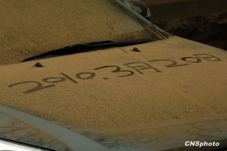 3月20日,春季首場(chǎng)重度浮塵天遮蓋了整個(gè)北京城。圖為北京市民私家車(chē)被浮塵覆蓋。中新社發(fā) 鄒憲 攝