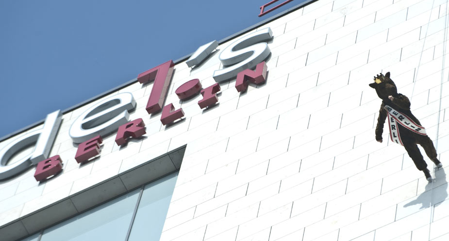 3月18日,在德國(guó)柏林舉行的“高樓漫步”活動(dòng)中,一名女子打扮成熊的模樣(柏林的象征)在天使酒店外墻上行走,參加活動(dòng)的人都有繩索保護(hù)。圖片來源:中國(guó)新聞網(wǎng)