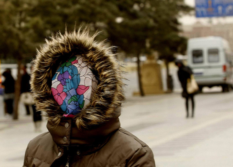 20日,北京遭遇4年來最強(qiáng)浮塵襲擊。一位行人將自己用紗巾“武裝”起來。