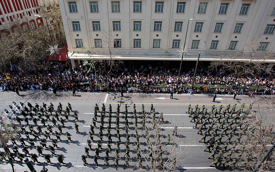 3月25日,在希臘首都雅典的憲法廣場(chǎng),人們參加獨(dú)立戰(zhàn)爭(zhēng)紀(jì)念日慶;顒(dòng)。圖片來(lái)源:中國(guó)新聞網(wǎng)
