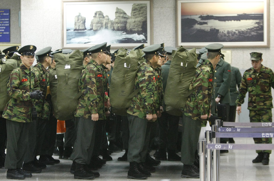 首爾當(dāng)?shù)貢r(shí)間26日晚9點(diǎn)45分許,在韓國(guó)西部海域執(zhí)行警戒任務(wù)的天安艦(1200噸級(jí))因不明原因事故,船底被炸開(kāi)洞,船尾開(kāi)始下沉。天安艦上共有104人,韓國(guó)巡邏艇和直升飛機(jī)迅速展開(kāi)救援行動(dòng),事發(fā)5小時(shí)后,官員稱已救出58人,但因?yàn)閺?qiáng)風(fēng)和夜幕,救援行動(dòng)進(jìn)展緩慢,其它人員仍下落不明。圖為韓國(guó)海軍海上救援隊(duì)正在整裝準(zhǔn)備出發(fā)。