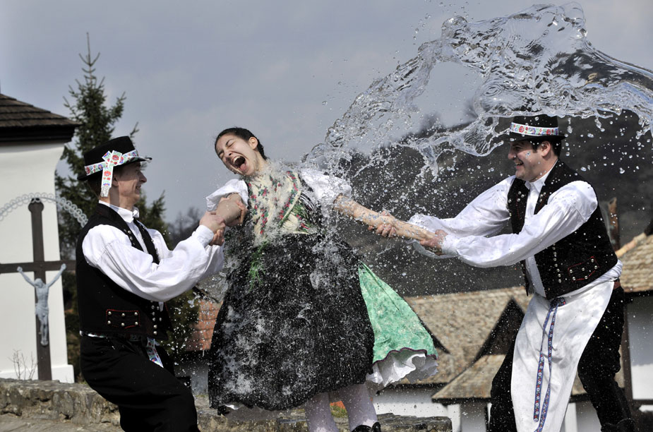 3月26日,在匈牙利首都布達佩斯以東被譽為世界文化遺產(chǎn)的霍洛克村,當?shù)鼐用褚韵蚬媚锷砩蠞娝膫鹘y(tǒng)儀式慶祝復(fù)活節(jié)。此項古老習俗起源于公元2世紀。