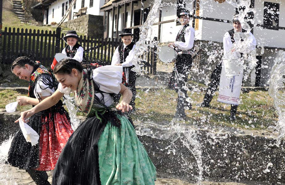 3月26日,在匈牙利首都布達(dá)佩斯以東被譽(yù)為世界文化遺產(chǎn)的霍洛克村,當(dāng)?shù)鼐用褚韵蚬媚锷砩蠞娝膫鹘y(tǒng)儀式慶祝復(fù)活節(jié)。此項(xiàng)古老習(xí)俗起源于公元2世紀(jì)。