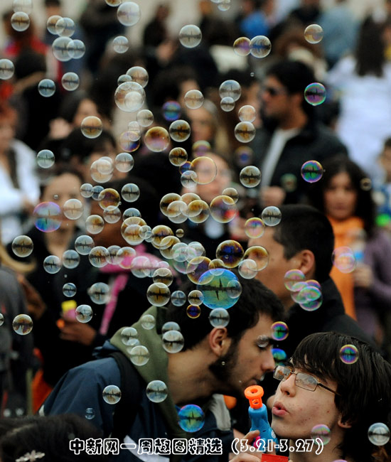 3月21日,在意大利羅馬城中的波波洛廣場,參加“快閃”族聚會的人們吹泡泡迎接春天的到來。圖片來源:中國新聞網(wǎng)>>點擊觀看詳細(xì)內(nèi)容