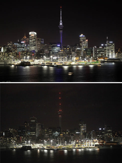 由世界自然基金會發(fā)起的“地球一小時”環(huán);顒27日20點30分按照時區(qū)依次在全球數(shù)千個城市展開。圖為新西蘭天空塔在熄燈前和熄燈后的景色。