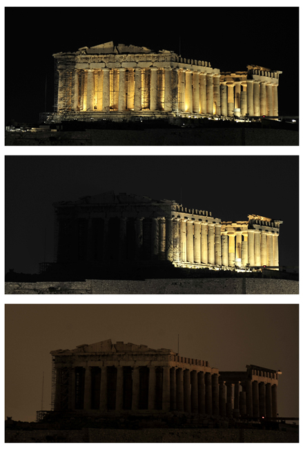 由世界自然基金會發(fā)起的“地球一小時”環(huán)保活動27日20點30分按照時區(qū)依次在全球數(shù)千個城市展開。圖為希臘帕特農(nóng)神廟在熄燈前和熄燈后的景色。