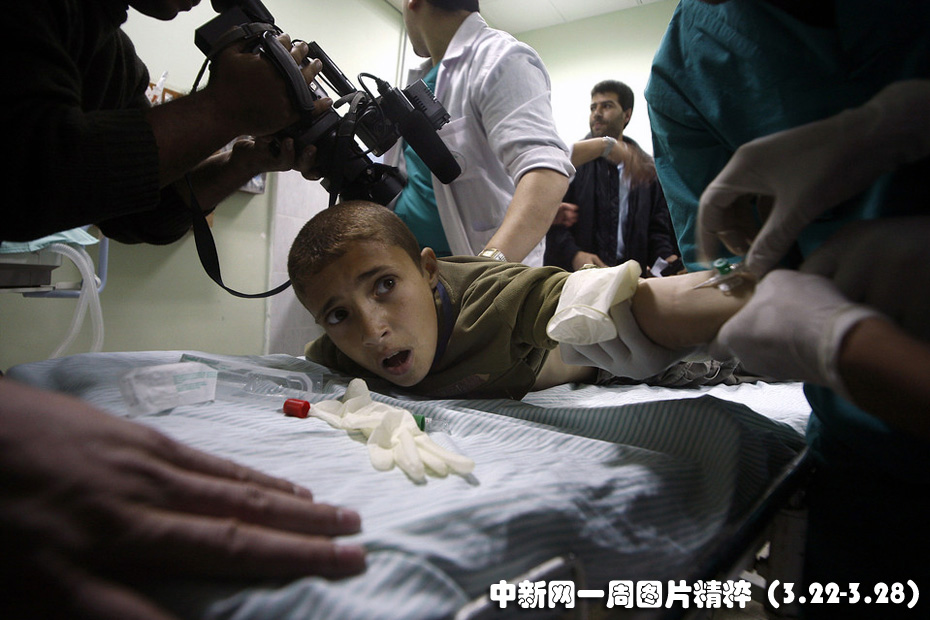 3月26日,加沙地帶的醫(yī)務(wù)人員正在治療一個(gè)被彈片擊中的男孩。在交火中兩名以色列士兵和兩名巴勒斯坦人被打死。