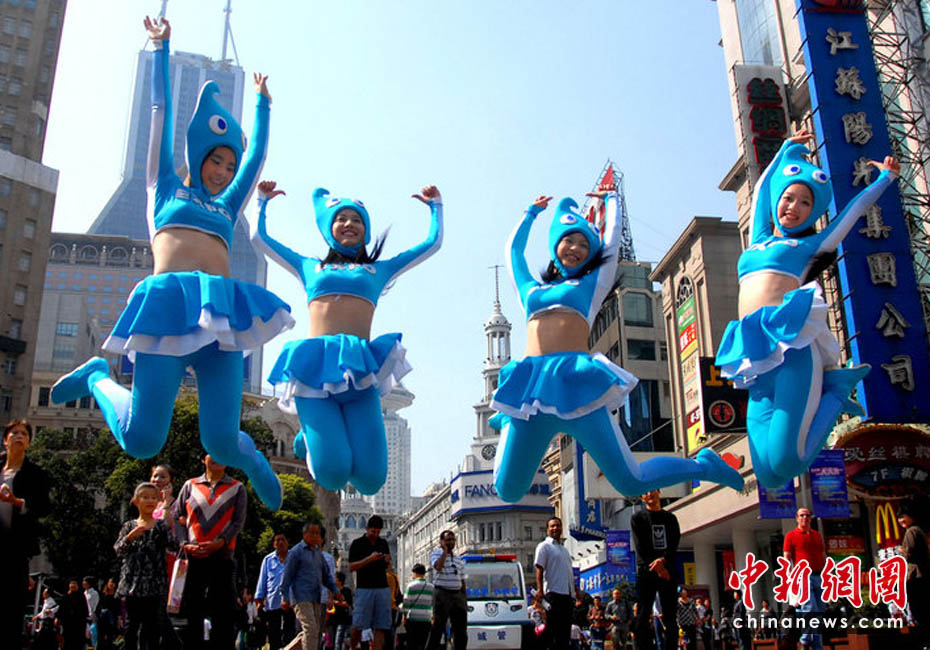上海南京路步行街,幾名“海寶”打扮的少女出現(xiàn)在街頭,引起不少路人和游客的觀看。這是上海商貿(mào)旅游學(xué)校的女學(xué)生扮演的“歡樂海寶”,她們參加演出后,在街頭通過生動的形體語言來展示世博會的可愛吉祥物--“海寶”。 楊毅CFP