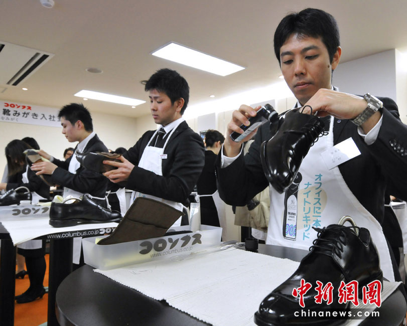 4月1日,日本一家鞋油廠新員工在入職儀式上為老員工擦鞋。圖片來源:中國新聞網(wǎng)