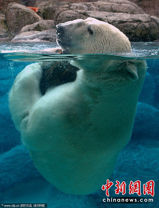 美國Asheboro北卡羅來納動(dòng)物園一頭名叫威利的北極熊可是個(gè)“活寶”。任何一個(gè)可用的東西都能成為它在鏡頭前“耍寶”的玩具。圖片來源:CFP