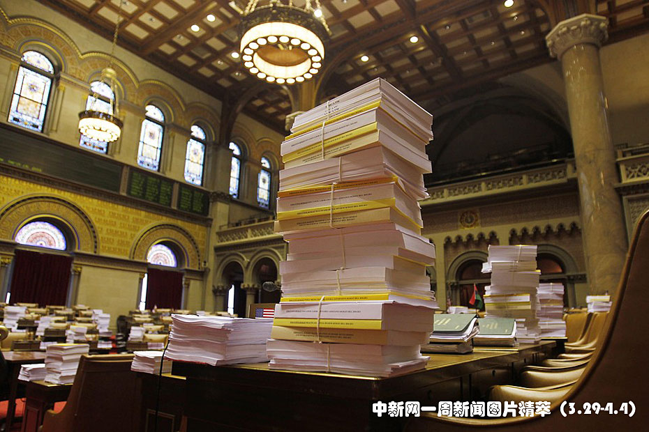 周一(29日),預算法案堆積在紐約州立委辦公室的桌子上。