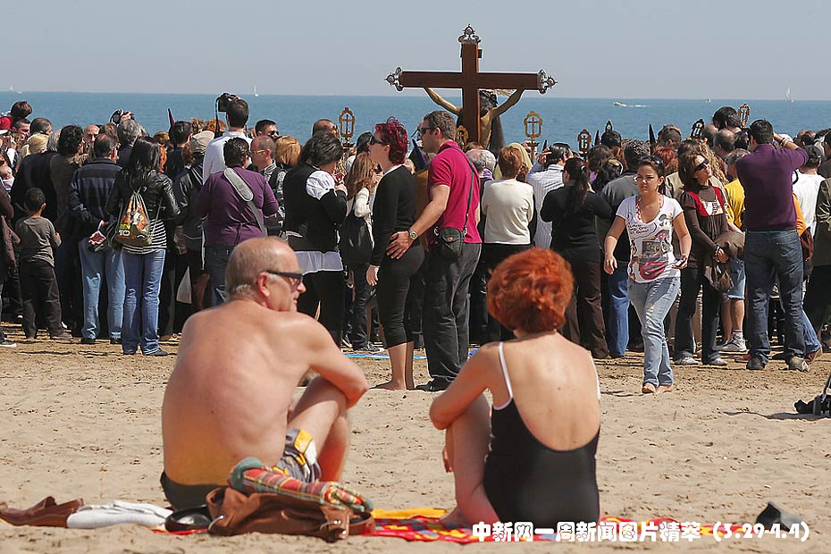 周五(2日),西班牙巴倫西亞,人們在海灘舉行復活節(jié)游行。