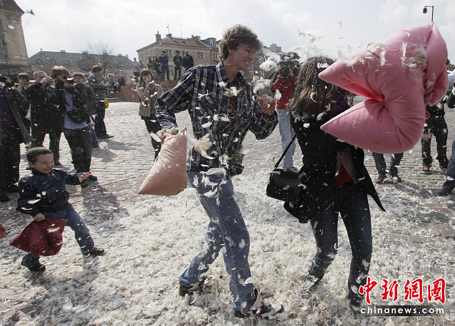 4月3日是國際“枕頭大戰(zhàn)”日。在這一天,多個國家的“枕頭大戰(zhàn)”愛好者相約走上街頭,用獨特的方式來慶祝他們的節(jié)日。圖片來源:中國新聞網(wǎng)
