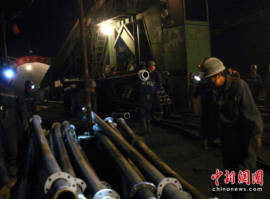 28日下午,華晉焦煤有限責(zé)任公司王家?guī)X煤礦發(fā)生透水事故。經(jīng)核查,初步確認(rèn)事故發(fā)生時(shí)當(dāng)班下井261人,升井108人,有153人被困井下。圖為礦工在井下運(yùn)送搶險(xiǎn)設(shè)備。中新社發(fā) 張?jiān)?攝
