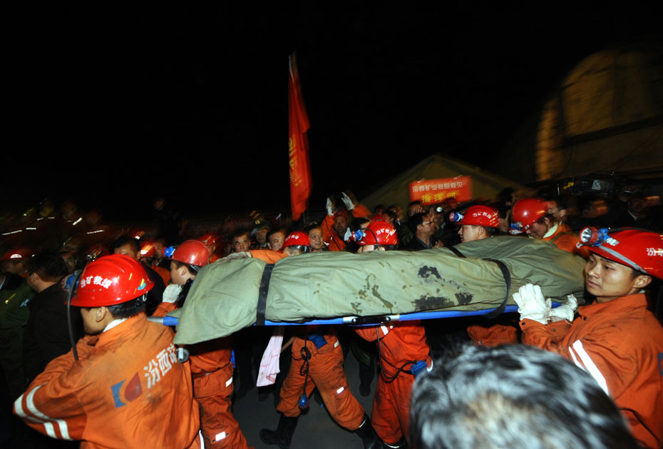 4月5日,首批獲救礦工被抬出井口。當(dāng)日,華晉焦煤王家?guī)X礦“3·28”透水事故首批獲救礦工升井,被急救車送往醫(yī)院救治。目前現(xiàn)場(chǎng)救援工作仍在進(jìn)行。圖片來(lái)源:新華網(wǎng) 燕雁 攝