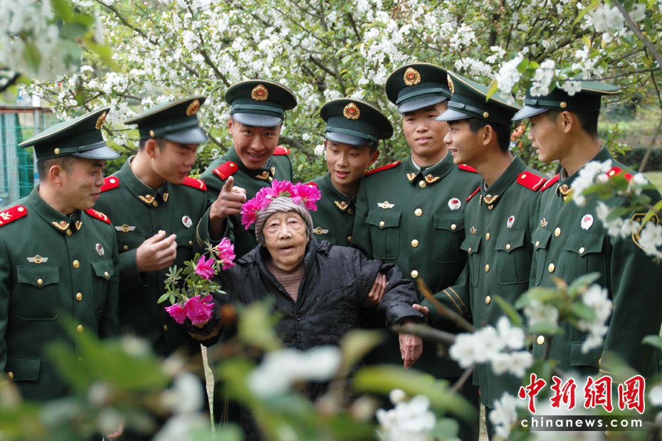 4月4日, 武警浙江省溫嶺市中隊(duì)10多位剛下中隊(duì)的新兵們,首次專(zhuān)門(mén)帶孤寡老人林文錦到城郊踏春游。當(dāng)日,新兵們商定派代表扶奶奶去“春游”。93歲的林文錦奶奶開(kāi)心地說(shuō):“今天,是第33次短途‘春游’。中新社發(fā) 江勇兵 攝