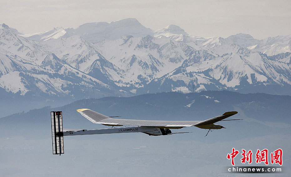 當(dāng)?shù)貢r間4月7日上午,全球首架依靠太陽能驅(qū)動的飛機進行首次試飛,預(yù)計此種新型飛機將在2011年實現(xiàn)環(huán)球航行。圖片來源:中國新聞網(wǎng)