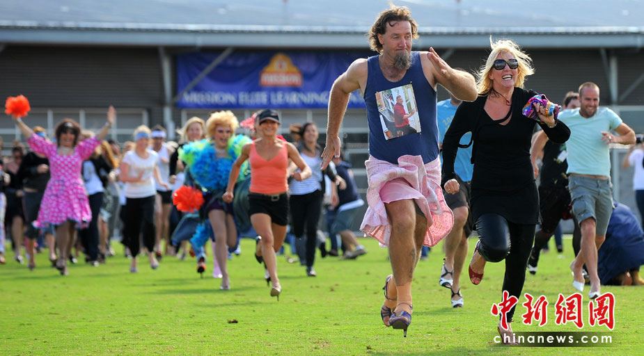 4月10日,在澳大利亞墨爾本,人們穿著高跟鞋賽跑。旨在挑戰(zhàn)多人穿高跟鞋賽跑的吉尼斯世界紀錄。盡管最終挑戰(zhàn)失敗,參賽者仍在80米的賽道上爭先恐后,各顯神通。