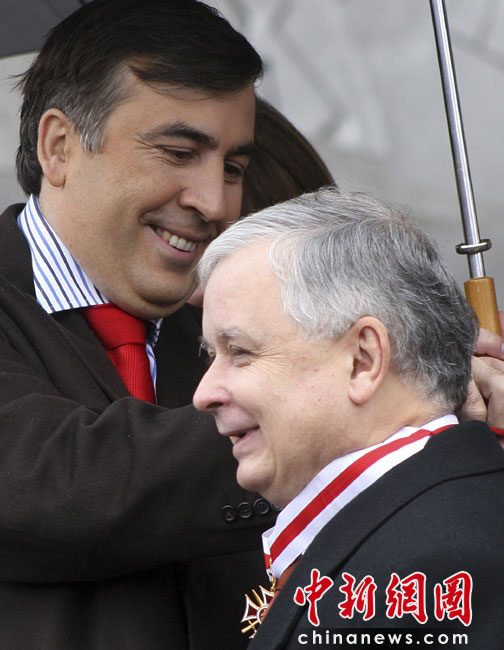 波蘭總統(tǒng)卡欽斯基乘坐的一架圖-154飛機(jī)10日在俄羅斯斯摩棱斯克州北部一軍用機(jī)場降落時(shí)失事,至少87人死亡?J斯基本人被確認(rèn)身亡。圖為2007年波蘭總統(tǒng)卡欽斯基與格魯吉亞總統(tǒng)米哈伊爾薩卡什維利。