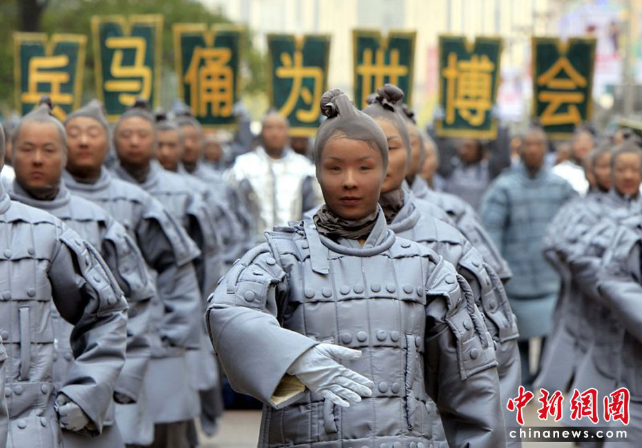 4月10日,由西安旅游局承辦的兵馬俑牽手上海世博會(huì)大型旅游宣傳咨詢活動(dòng)舉行。來(lái)自兵馬俑故鄉(xiāng)的百人表演隊(duì)伍,身著灰色的兵馬俑服裝,以鏗鏘的節(jié)奏、雄壯的氣勢(shì),在上海南京東路步行街和東方明珠廣場(chǎng)游演,吸引了大批市民及海內(nèi)外游客駐足觀看。文音/CFP