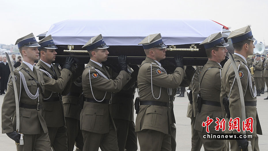 4月10日,卡欽斯基乘坐專(zhuān)機(jī)從華沙飛往俄羅斯斯摩棱斯克市,參加卡廷森林事件70周年紀(jì)念活動(dòng)。途中飛機(jī)在斯摩棱斯克“北方”軍用機(jī)場(chǎng)附近降落時(shí)失事,共造成包括卡欽斯基夫婦及眾多政府高官在內(nèi)的96人死亡。慘劇發(fā)生后,舉世震驚。圖為禮兵將卡欽斯基的遺體抬上靈車(chē)。