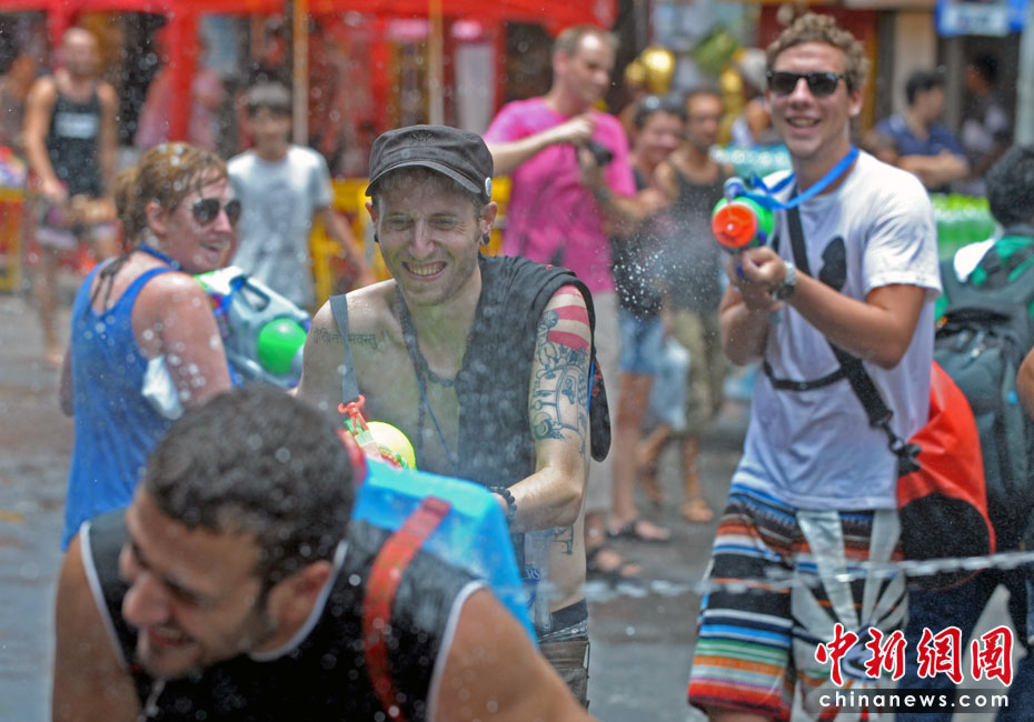 4月12日,泰國迎來一年一度的潑水節(jié),在拷桑路旅游區(qū)人們用水槍與大象“互噴”希望為對(duì)方送上祝福同時(shí)慶祝泰國新年。圖片來源:中國新聞網(wǎng)