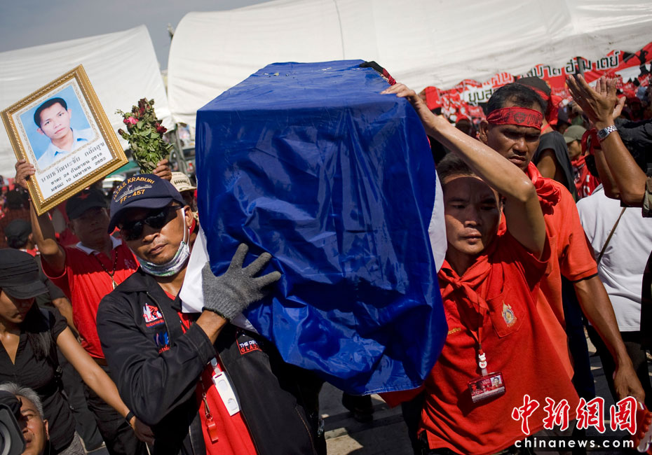 紅衫軍一名領(lǐng)導(dǎo)人稱(chēng),他們抬著11個(gè)棺材進(jìn)行游行,里面放著死于周六暴力沖突的喪生者遺體。泰國(guó)政府部門(mén)稱(chēng),當(dāng)天有4名軍人和17名平民死亡,政府周一將對(duì)9具尸體進(jìn)行尸檢。圖片來(lái)源:中國(guó)新聞網(wǎng)