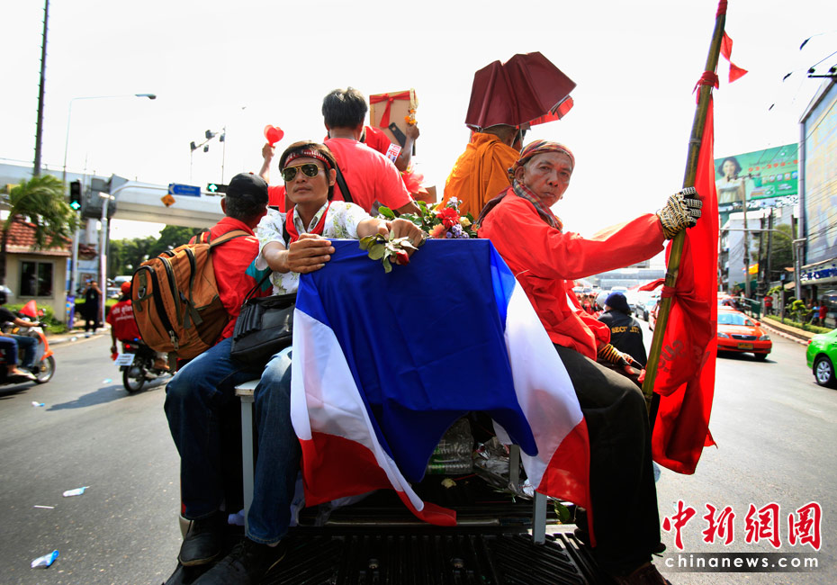 當(dāng)?shù)貢r(shí)間4月12日,泰國紅衫軍在曼谷市區(qū)抬著棺材舉行游行,借此向政府施壓促阿披實(shí)下臺。此前紅衫軍示威者與軍警發(fā)生沖突,造成21人死亡。圖片來源:中國新聞網(wǎng)