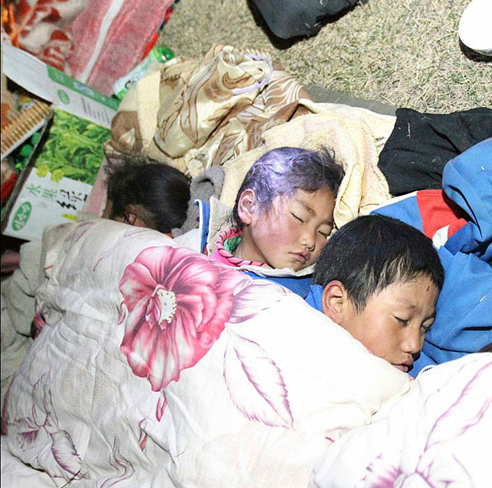 圖為4月14日深夜,幾名受災(zāi)兒童在露天睡覺,他們的父母正在旁邊搭建帳篷。圖片來源:新華網(wǎng) 丁林?jǐn)z