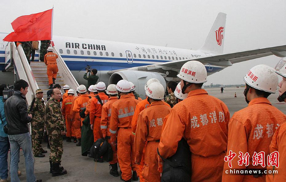 圖為4月14日18時02分和18時08分,國航西南分公司執(zhí)行緊急救援包機的一架空中客車A319和一架波音757飛機共搭載302名消防救災(zāi)人員和搜救設(shè)備從成都雙流機場起飛,火速趕往西寧,將前往青海玉樹7.1級地震震區(qū)救援。中新社發(fā) 易世忠 攝