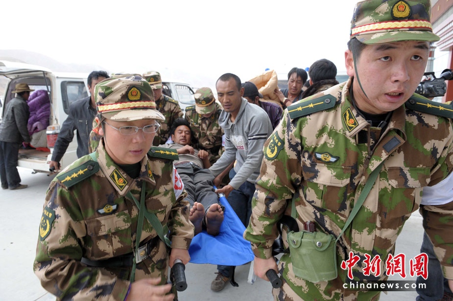 4月15日下午,云南邊防總隊(duì)醫(yī)療救援隊(duì)剛下飛機(jī)立即投入傷員轉(zhuǎn)移工作。圖為官兵們在玉樹機(jī)場從救護(hù)車上抬下地震危重傷員,進(jìn)行轉(zhuǎn)移安置和治療。中新社發(fā) 陳文 攝