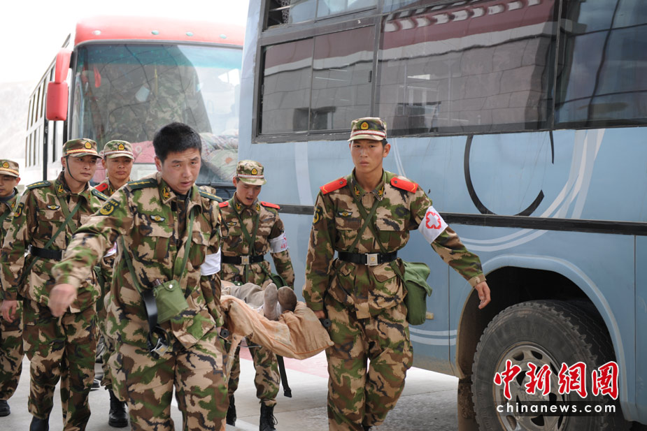 4月15日,玉樹地震傷員正源源不斷的從玉樹機場乘飛機,被運往成都等地救治。 中新社/中新網(wǎng)記者 符永康 攝