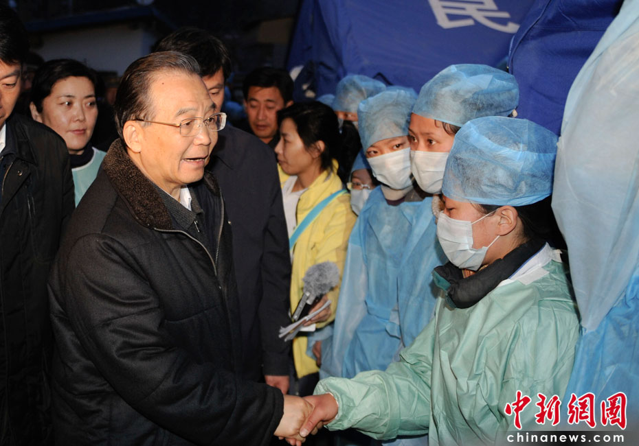 4月15日20時(shí),中國(guó)國(guó)務(wù)院總理溫家寶來到青海省玉樹縣玉樹自治州醫(yī)院看望受災(zāi)民眾和醫(yī)務(wù)人員。中新社發(fā) 廖攀 攝