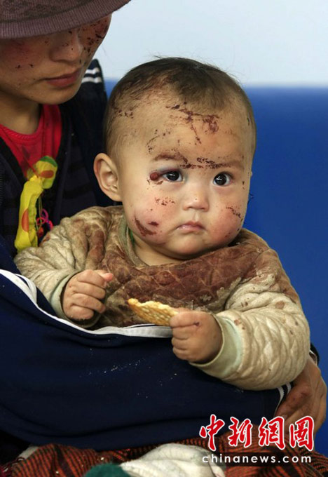 圖為4月15日,青海玉樹巴塘機(jī)場(chǎng),受傷的孩子等待轉(zhuǎn)運(yùn)至西寧等地治療。青友 攝