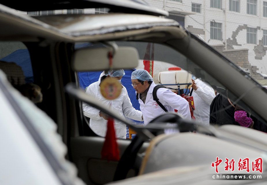 4月16日,青海玉樹體育場地震災民安置點,青海疾控中心人員開展消毒防疫工作。 中新社發(fā) 廖攀 攝