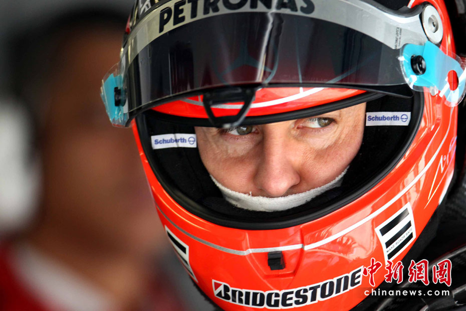 4月16日,2010國(guó)際汽聯(lián)F1世界錦標(biāo)賽上海站在上海國(guó)際賽車場(chǎng)開始車手第一、第二次練習(xí)賽。圖為代表梅賽德斯GP車隊(duì)出戰(zhàn)的老車王、德國(guó)車手舒馬赫重回上海賽道。 中新社記者 任晨鳴 攝