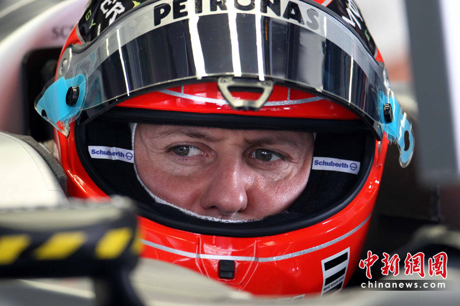 4月16日,2010國(guó)際汽聯(lián)F1世界錦標(biāo)賽上海站在上海國(guó)際賽車(chē)場(chǎng)開(kāi)始車(chē)手第一、第二次練習(xí)賽。圖為代表梅賽德斯GP車(chē)隊(duì)出戰(zhàn)的老車(chē)王、德國(guó)車(chē)手舒馬赫重回上海賽道。 中新社記者 任晨鳴 攝