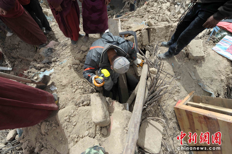 4月16日,青海玉樹地震救援進(jìn)入第三天,來自蘭州軍區(qū)、山東消防特勤、重慶特勤、廣東邊防總隊、云南邊防總隊、青海民兵等搜救隊連續(xù)搜救,幸存者奇跡生還。中新社發(fā) 陳文 攝