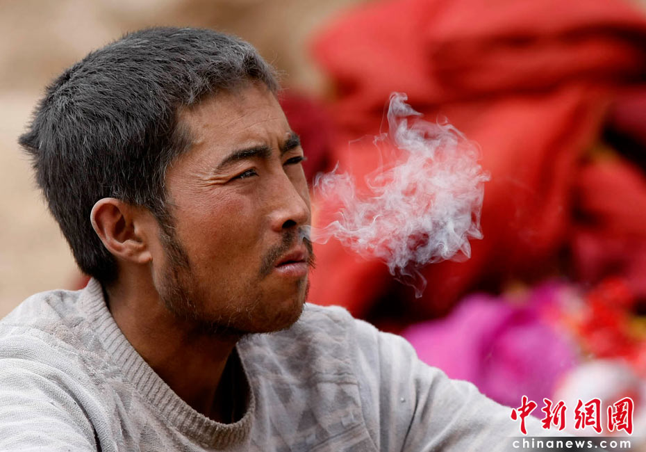 2010年4月16日,青海玉樹藏族自治州玉樹縣結古鎮(zhèn)一所中學的震災救援現(xiàn)場,一名救援人員在短暫的休息期間吸煙解乏。中新社發(fā) 盛佳鵬 攝