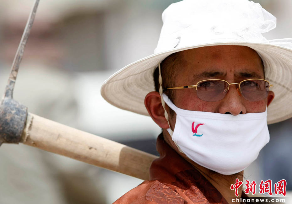2010年4月16日,青海玉樹藏族自治州玉樹縣結(jié)古鎮(zhèn)震災(zāi)現(xiàn)場,一名志愿者準(zhǔn)備參加救援。中新社發(fā) 盛佳鵬 攝