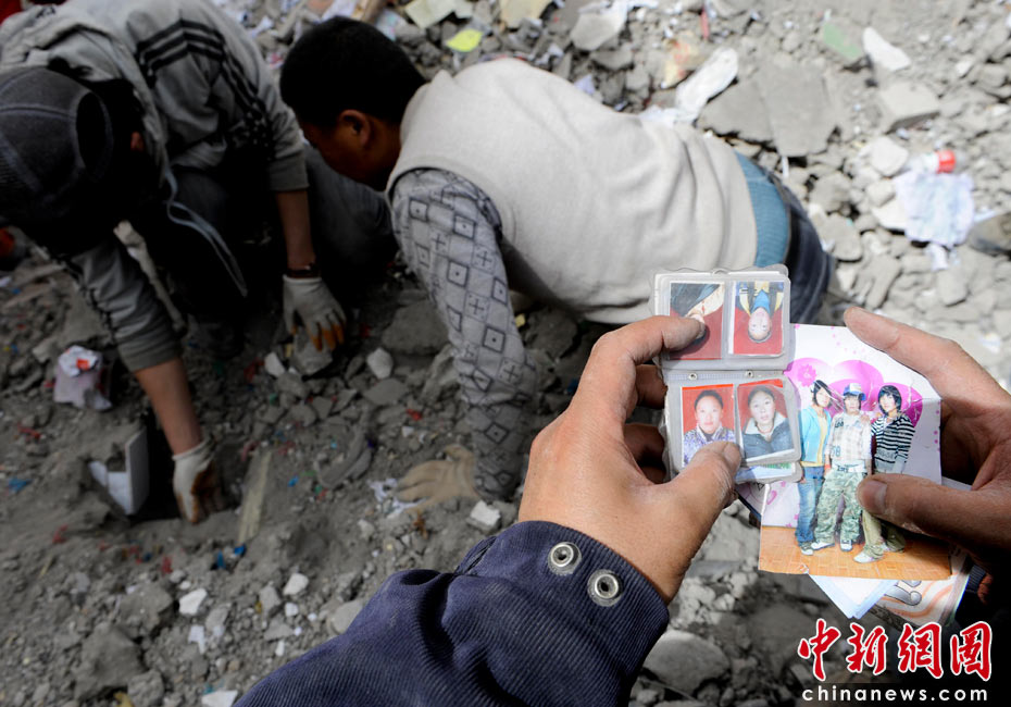 4月16日,青海玉樹民族師范學(xué)校內(nèi),玉樹州教育局官員扎西手持學(xué)生照片焦急等待現(xiàn)場救援進展。中新社發(fā) 廖攀 攝