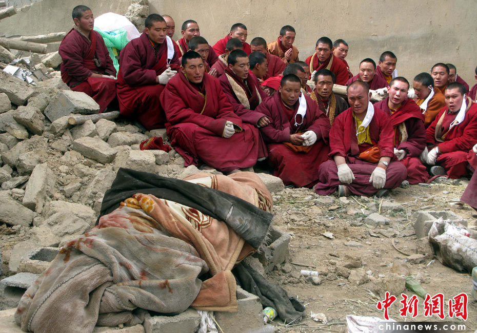 4月16日,青海玉樹震區(qū)僧侶們在廢墟邊為地震遇難者按藏族習俗進行超度。中新社發(fā) 孫自法 攝
