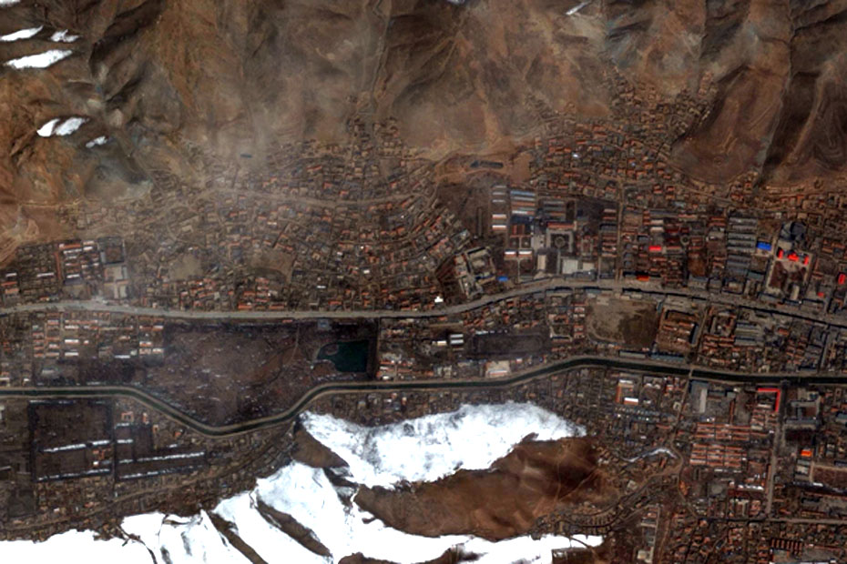 利用對(duì)地觀測(cè)中心2010年4月16日獲取的高分辨率航空遙感數(shù)據(jù),提取出玉樹(shù)州結(jié)古鎮(zhèn)城區(qū)范圍內(nèi)地震破壞最嚴(yán)重或典型地區(qū),使之與GoogleEarth中相應(yīng)位置的震前遙感衛(wèi)星數(shù)據(jù)進(jìn)行對(duì)比,直觀展現(xiàn)結(jié)古鎮(zhèn)在此次地震中的受影響程度。圖片來(lái)源:中國(guó)科學(xué)院