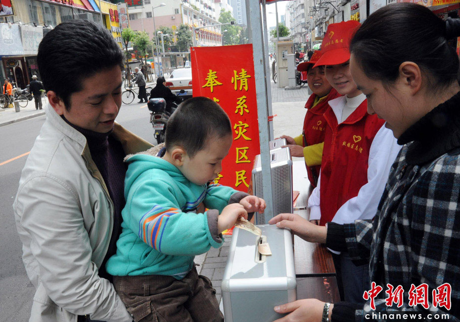 4月17日,一名兒童在家長的帶領(lǐng)下來到福州市區(qū)設(shè)立的捐款箱向青海省玉樹地震災(zāi)區(qū)捐款。當(dāng)日是周六假日,不少福州市民紛紛前往由福建省紅十字會、福州市紅十字會、福建慈善總會等在街頭設(shè)立的捐助點(diǎn),踴躍向青海省玉樹地震災(zāi)捐款。中新社發(fā) 劉可耕 攝