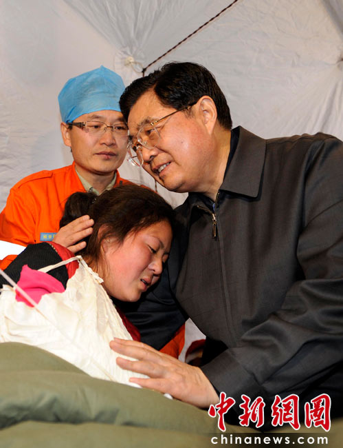 4月18日,中共中央總書記、國家主席、中央軍委主席胡錦濤來到青海玉樹體育場地震災(zāi)民安置點看望受災(zāi)民眾和醫(yī)務(wù)人員。中新社發(fā) 廖攀 攝
