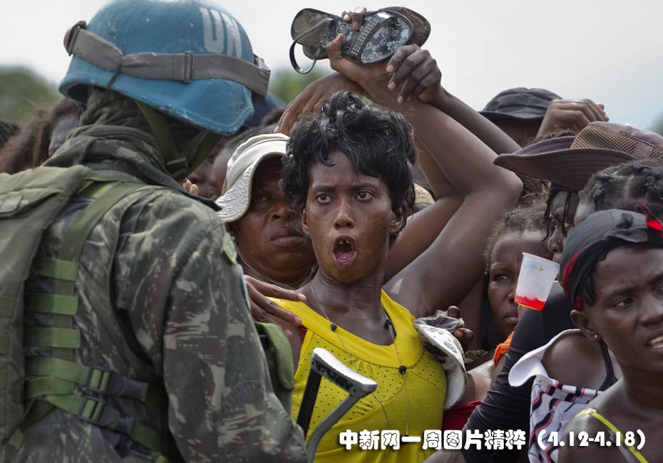 4月12日周一,海底太子港一個(gè)無家可歸的地震幸存者與前來分發(fā)食品的巴西聯(lián)合國維和人員發(fā)生口角。