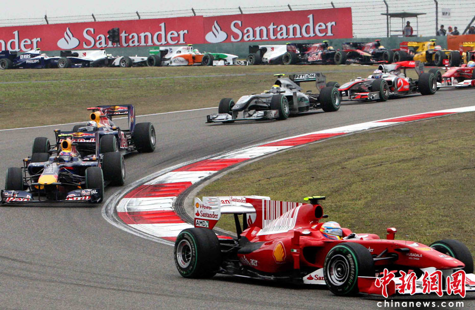 圖為法拉利車隊的西班牙車手阿隆索起跑神速超越兩名紅牛車手位居第一,但因“搶跑”受到處罰。中新社記者 任晨鳴 攝